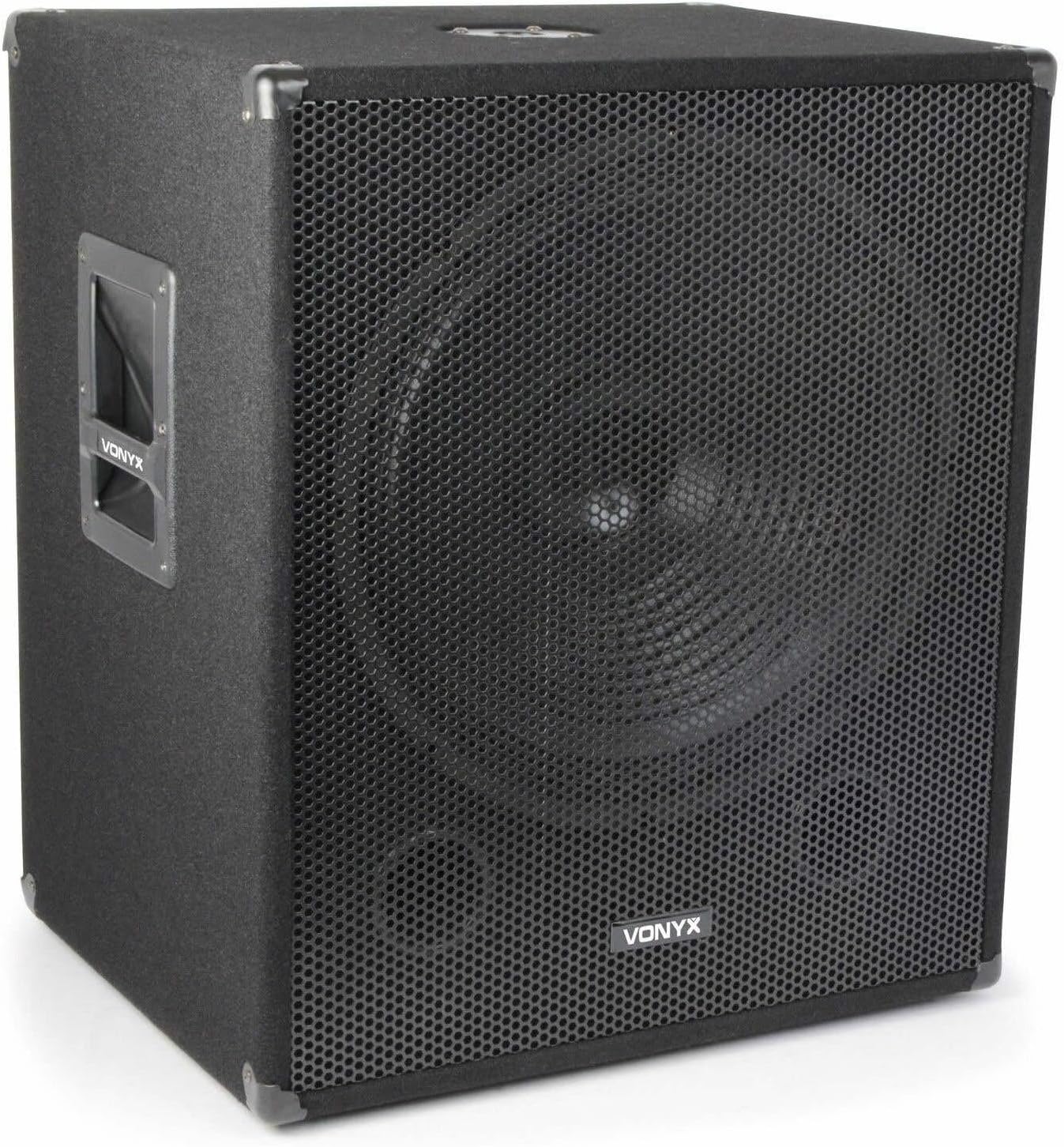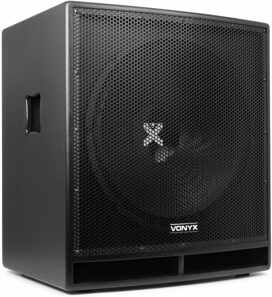 VONYX SWP18 Caisson de Basse Actif 1200W, Phase Réglable, Entrée/Sortie XLR + RCA, Amplificateur Intégré, Insert sur la Face Supérieure pour Enceinte Active, Grave 18", Idéal pour DJ Mobile