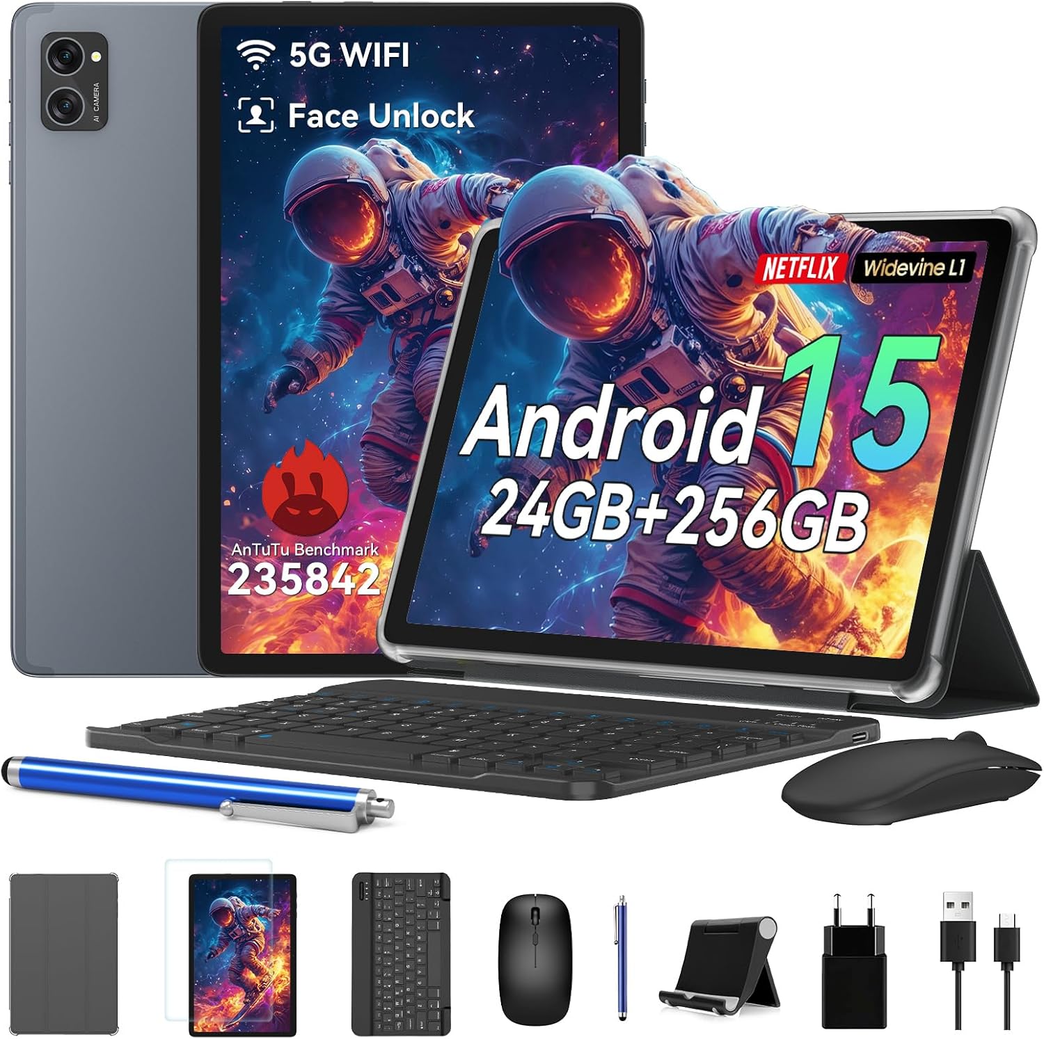 BESTTAB T20 Tablette Tactile 10 Pouces Android 15 avec Clavier Souris, 24Go RAM + 256Go ROM TF 2To , Pack 2 en 1 PC, Octa-Core, Widevine L1, Gemini AI, 5G WiFi, GPS, Gris