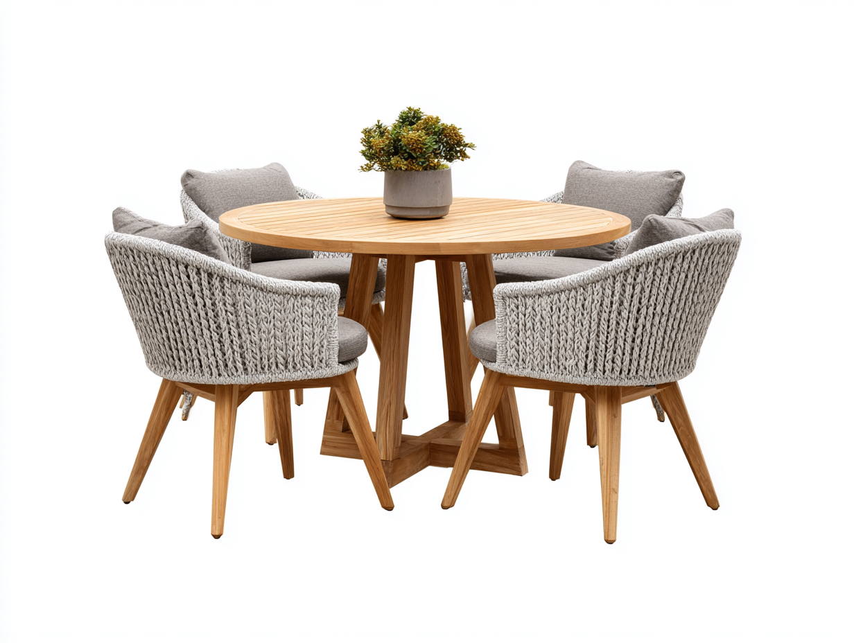 Salon de jardin repas table ronde et 4 fauteuils bois et corde 120x120x75 cm - bois naturel-gris - mobilier extérieur style moderne